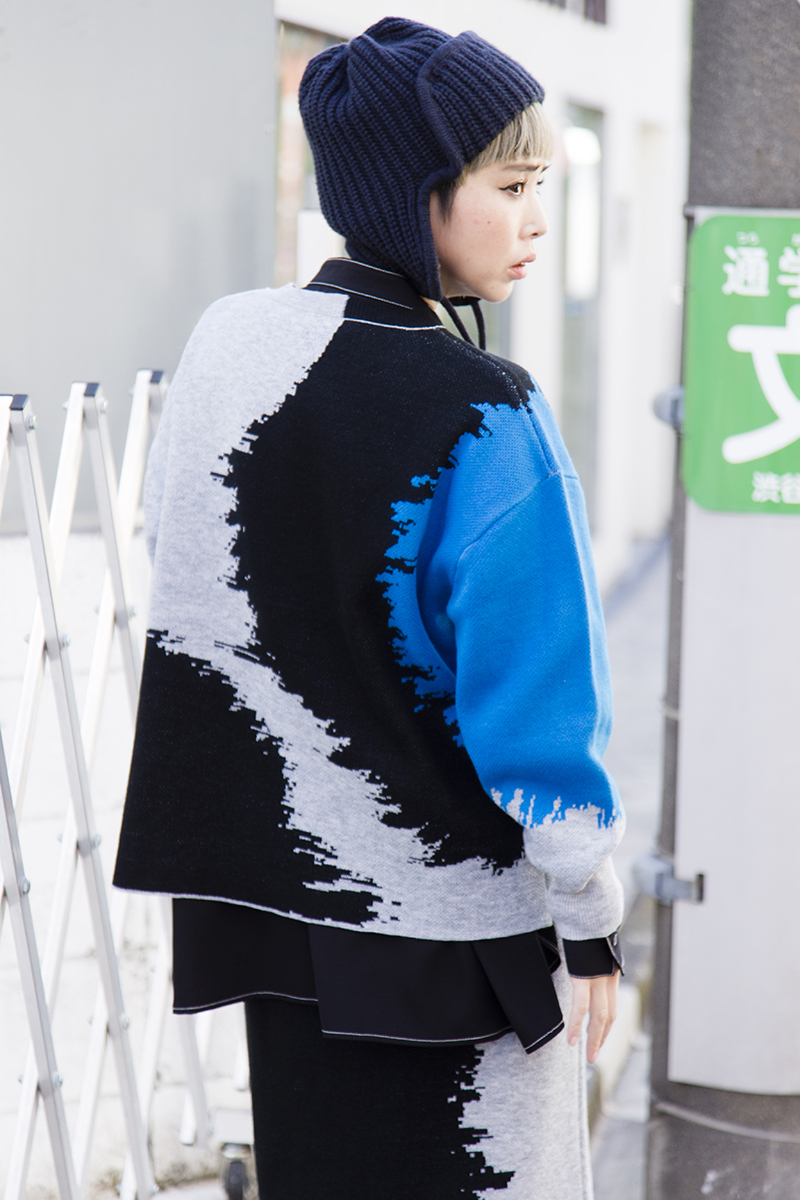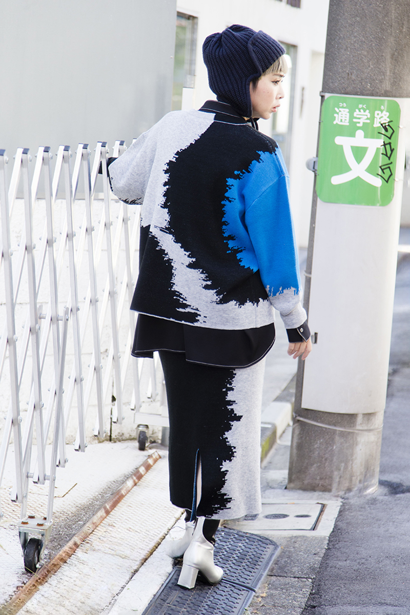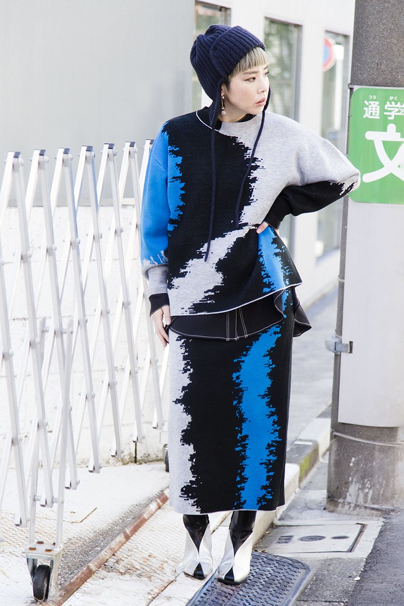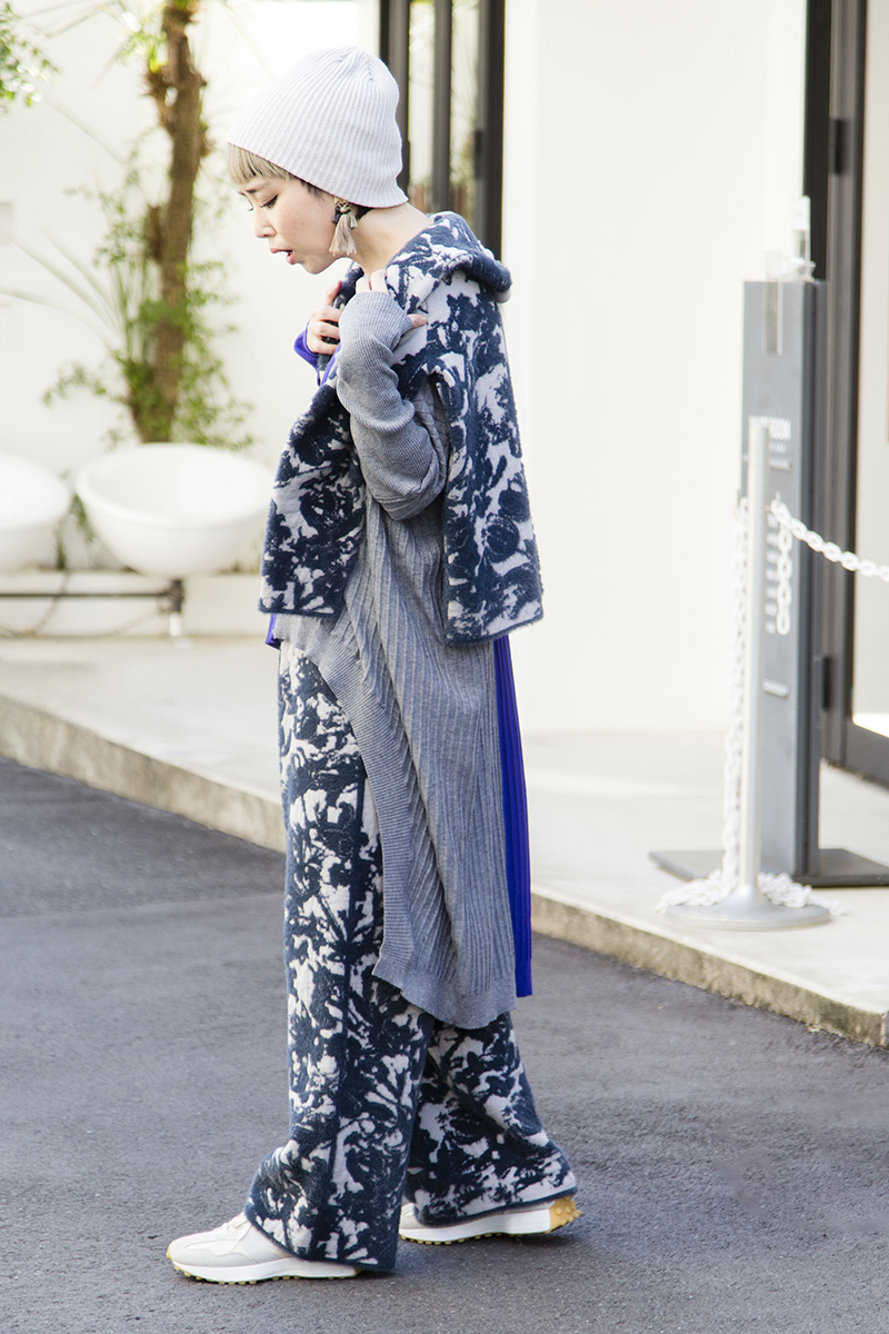 買い出し等、日常的にヘビーユースなパンツスタイルのニットアップ。