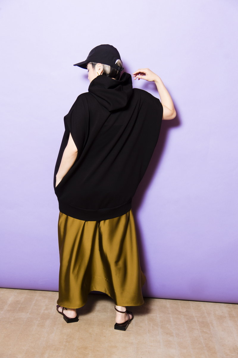 フーディ&ギャップは、ラフ過ぎて普段はやらないけど、リュクスなスカートとエレガントなシルエットのワンピだからこそ、カジュアルさを足す位が丁度いい。