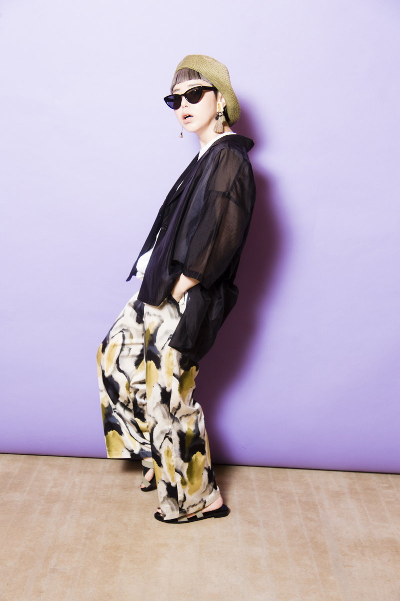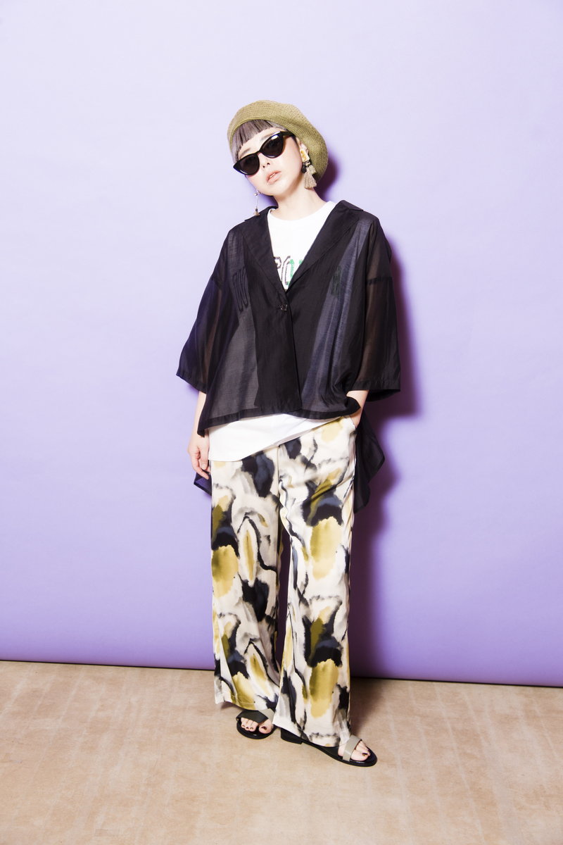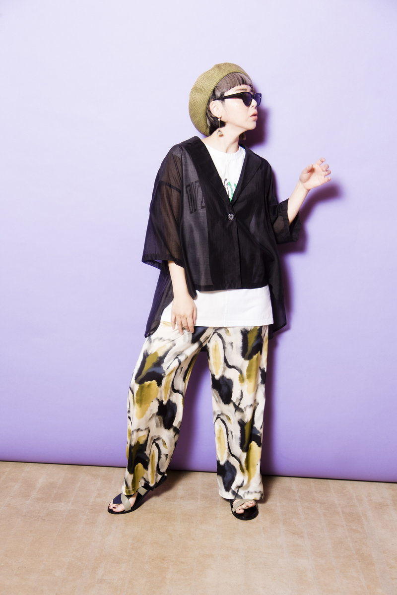 ロゴタンクにプリントパンツの賑やかさを、シアージャケットが落ち着かせてくれる。