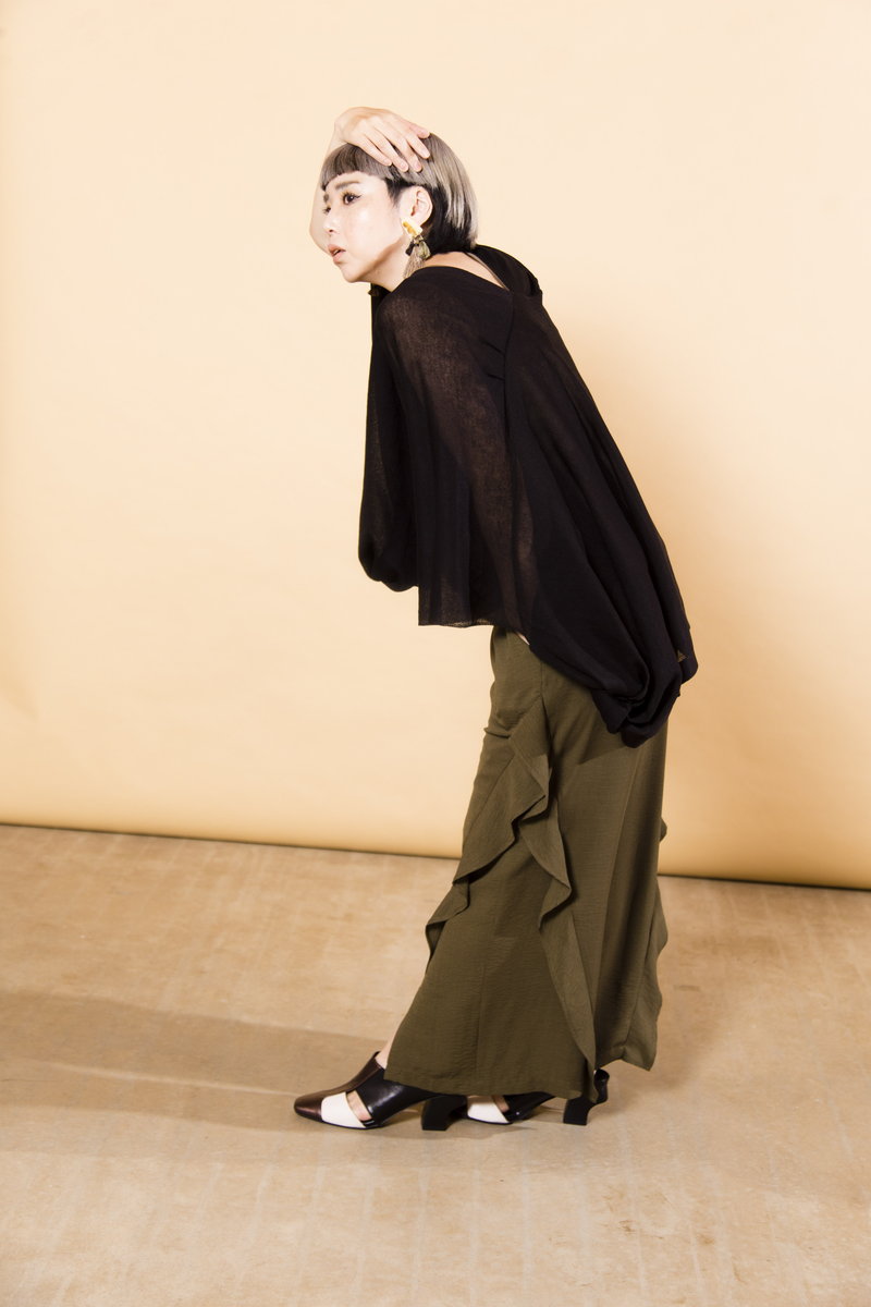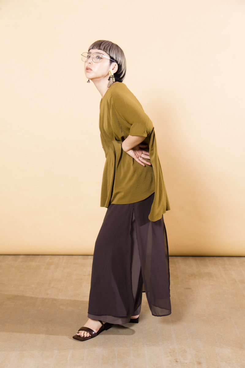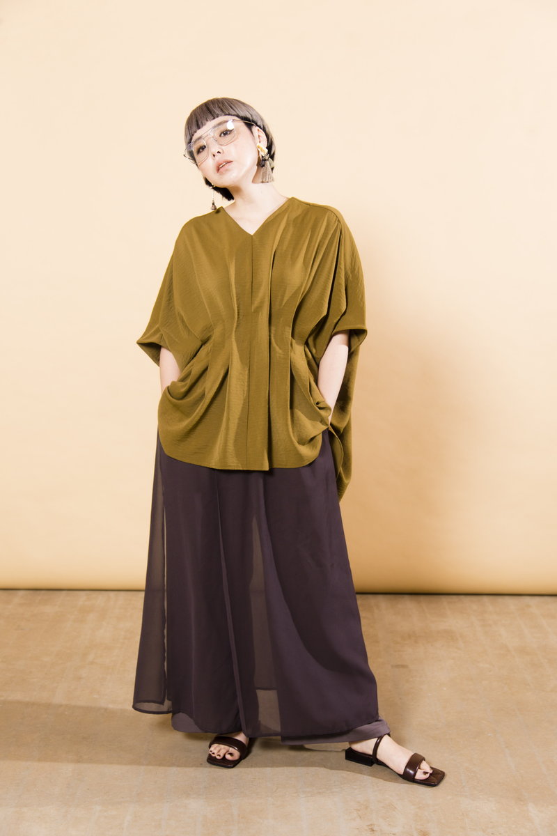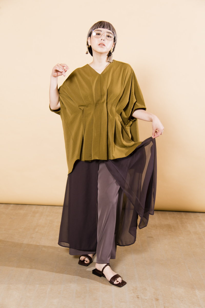 V-NECK TUCK BLOUSE¥8,690 CHIFFON LAYERED PANTS¥10,780 QUILTED SANDALS¥11,880