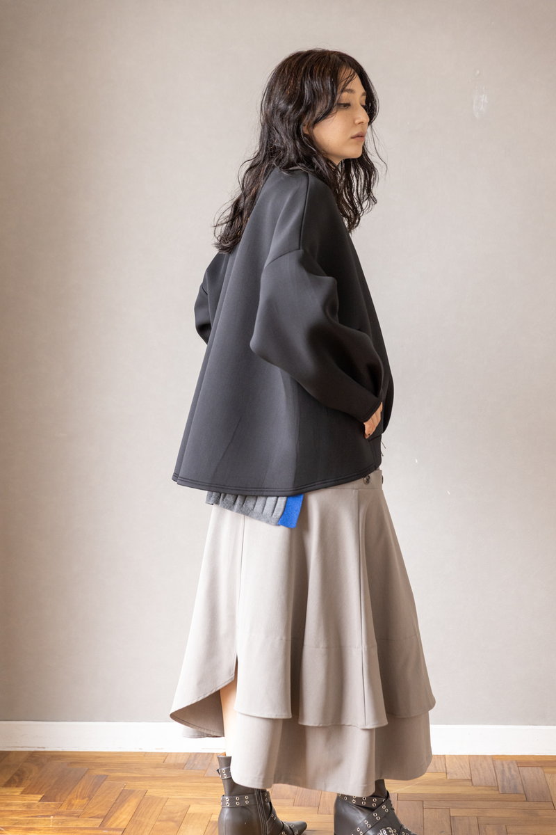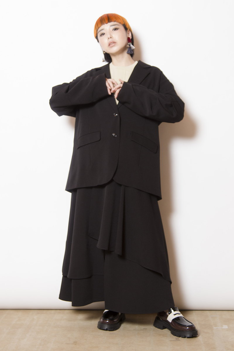 シックな黒がスカートのフェミニンさを引き立て、
