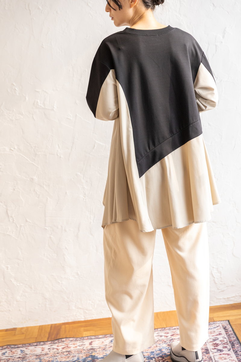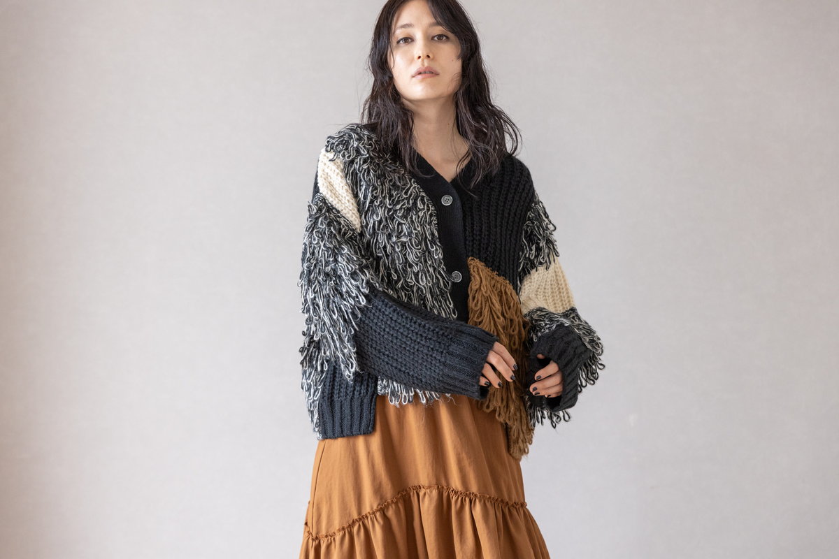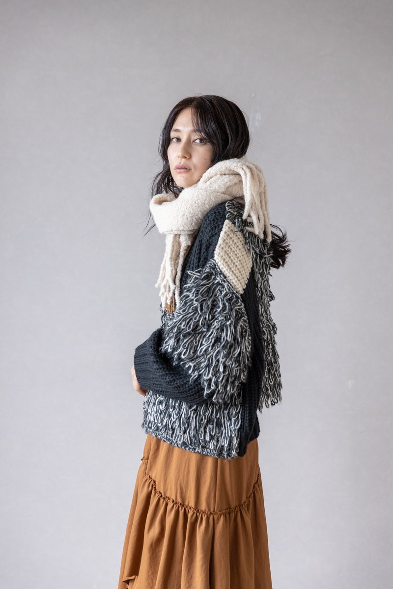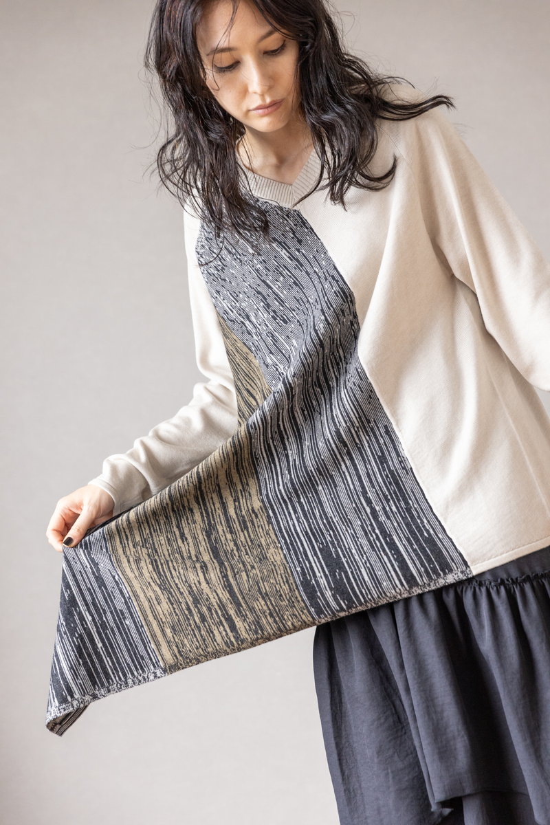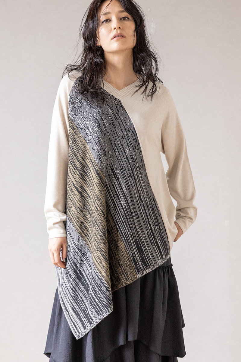 シャープなアシンメトリーニットに、