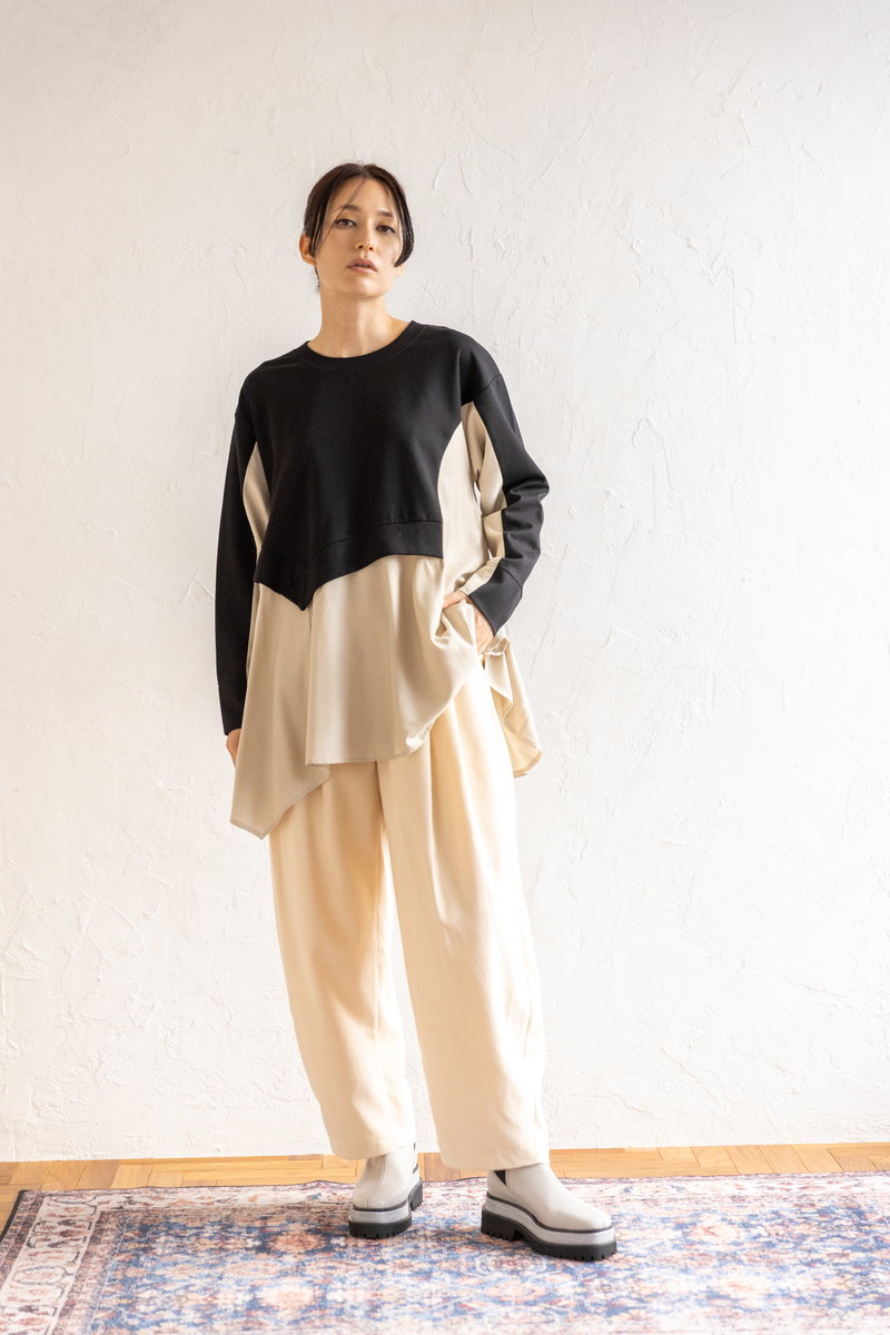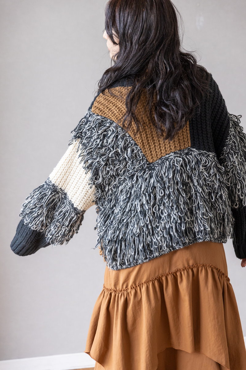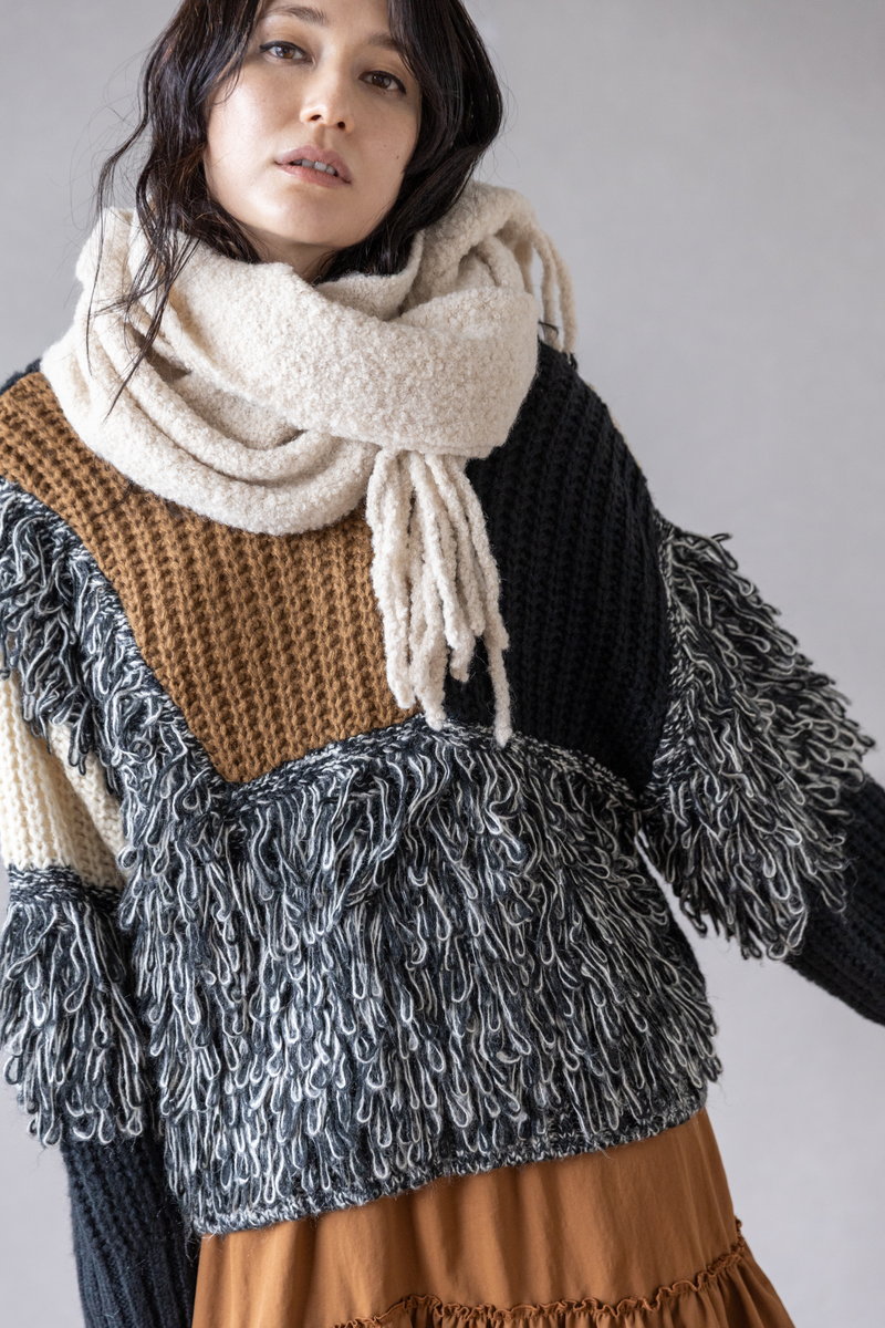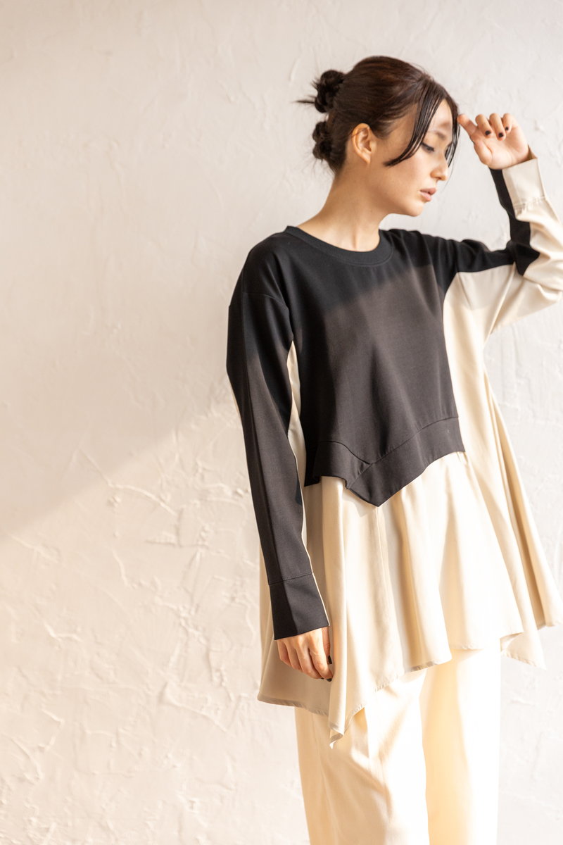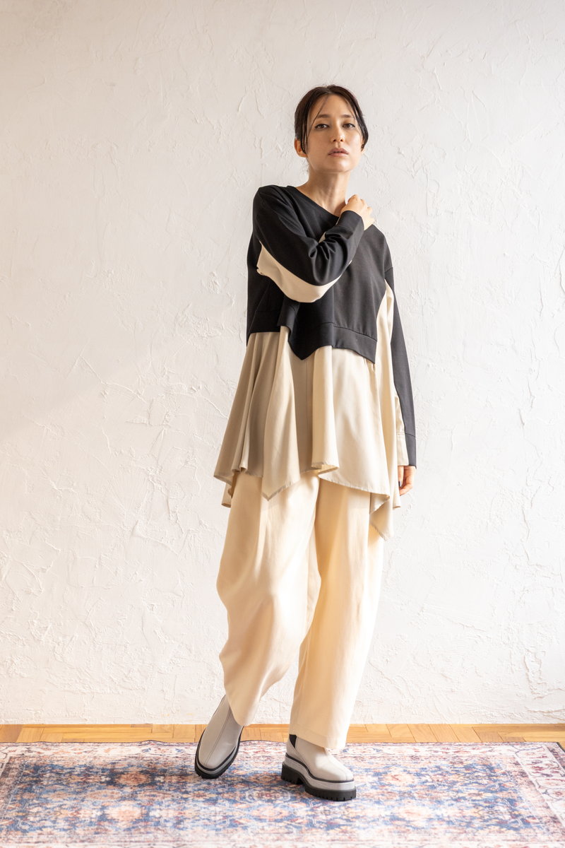 シャープなアシンメトリーニットに、