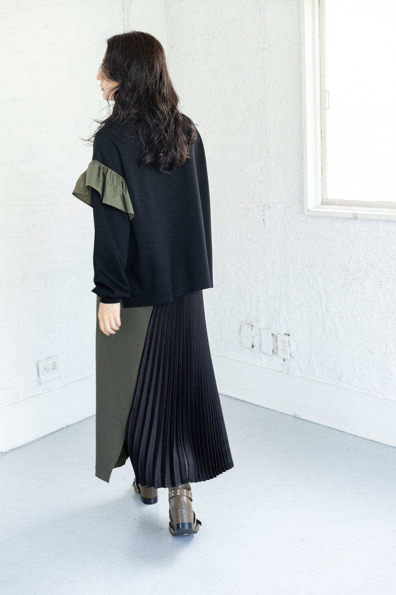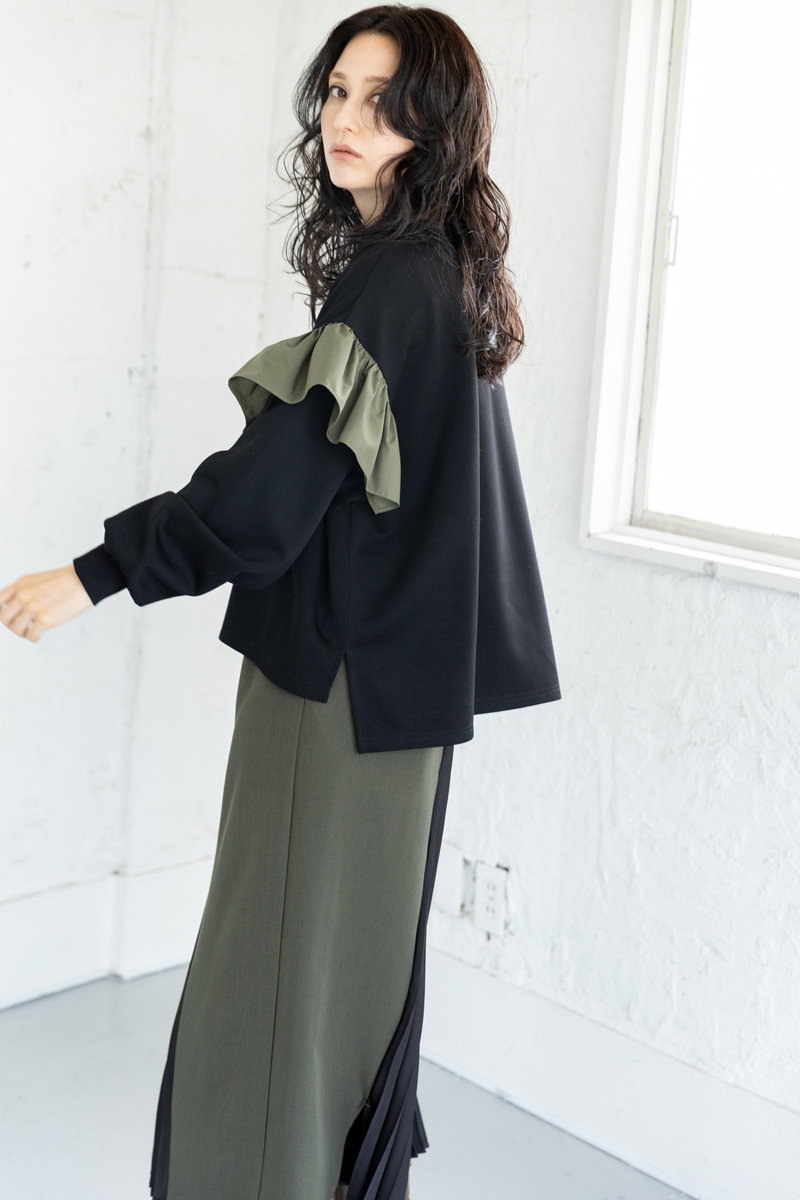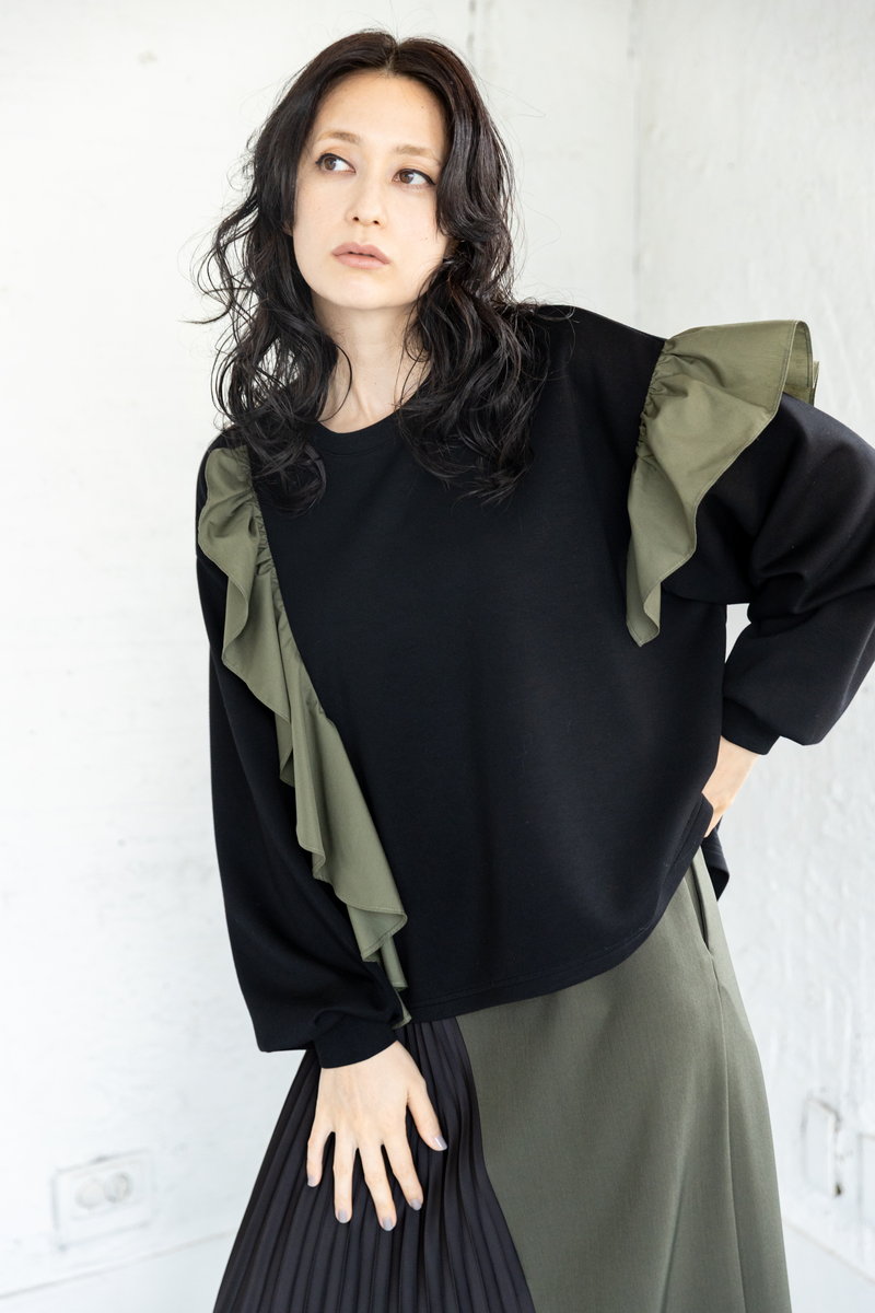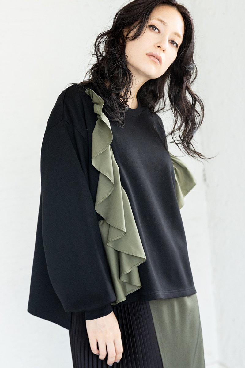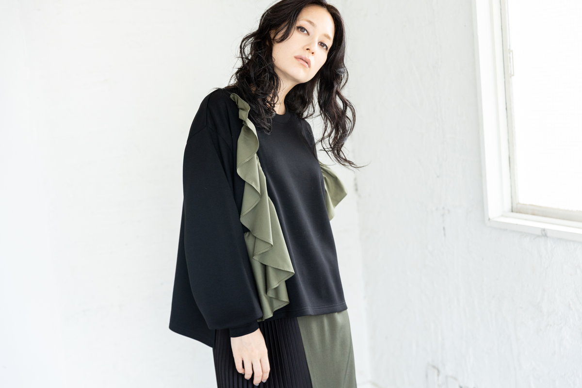 大ぶりのフリルをモードに印象付けるのは、