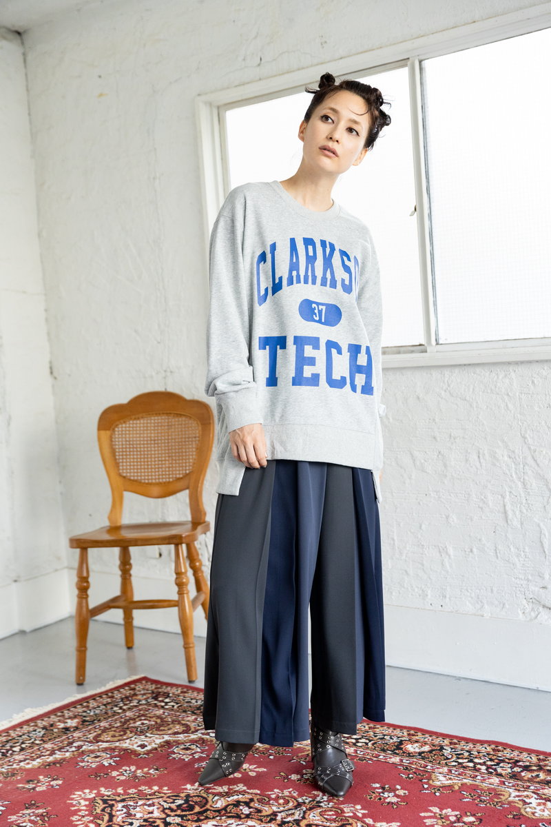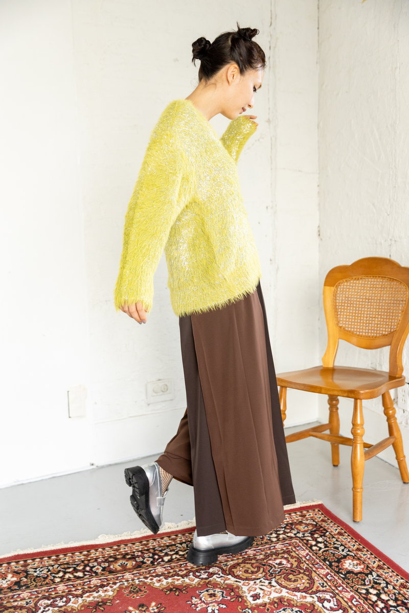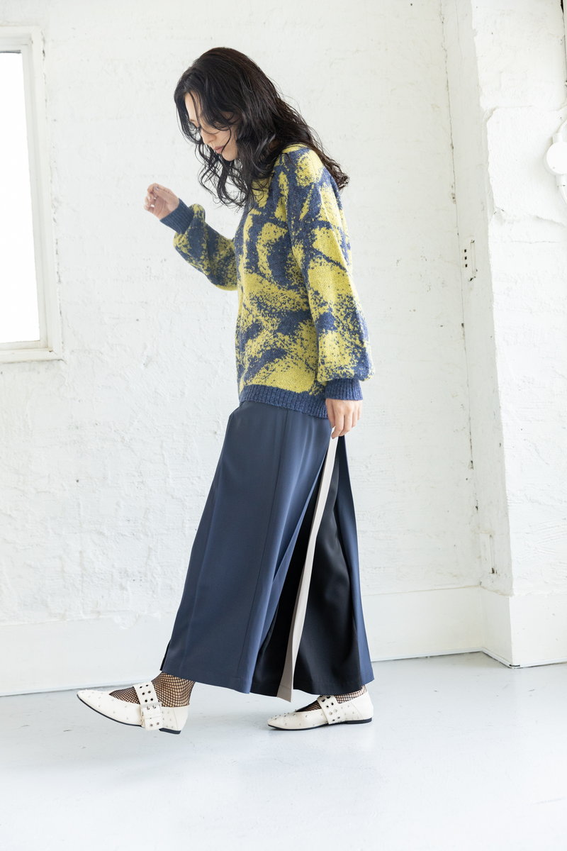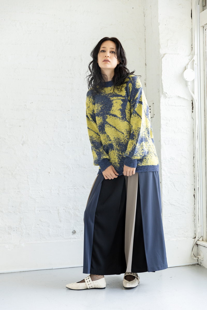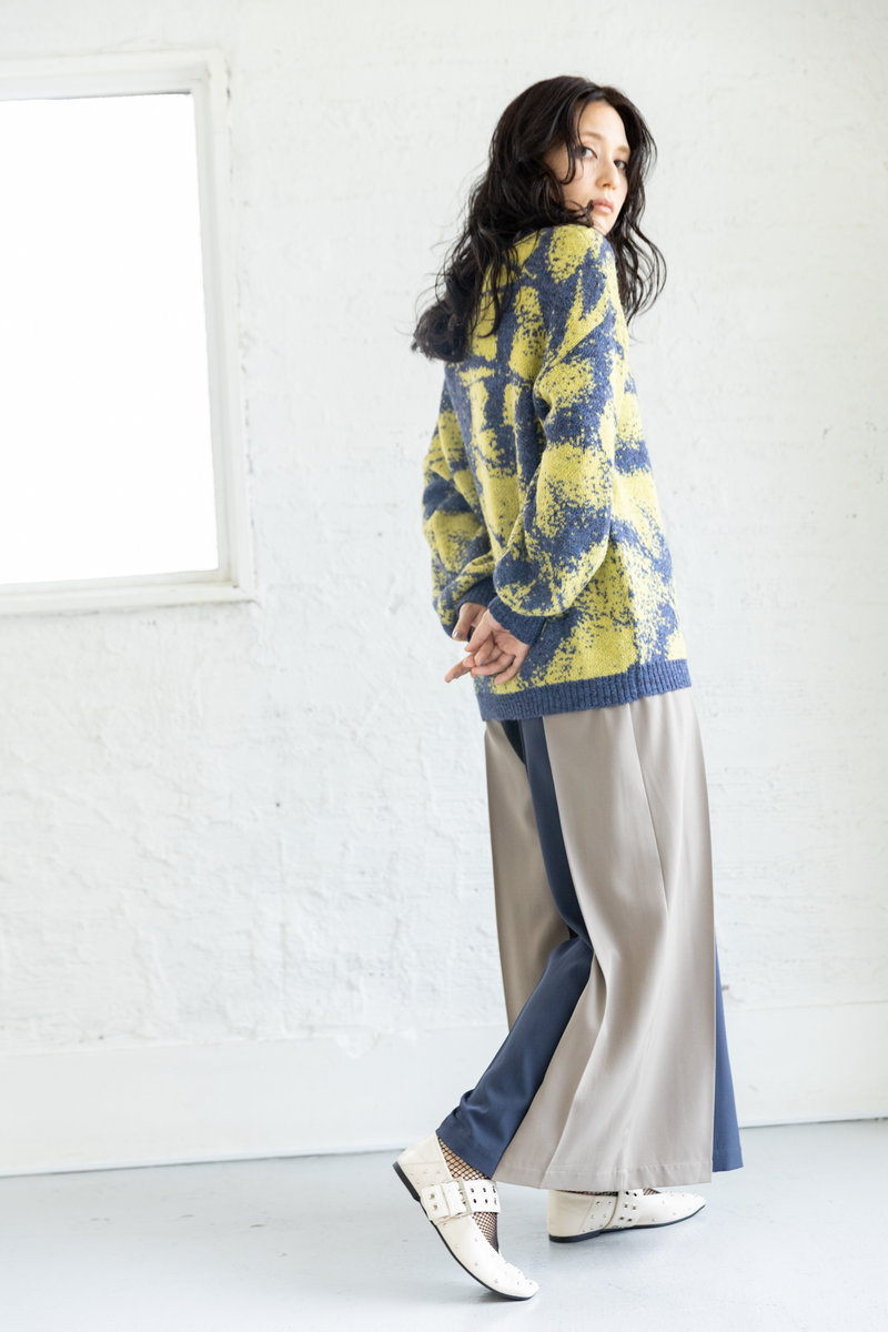 トライカラーのワイドパンツ。