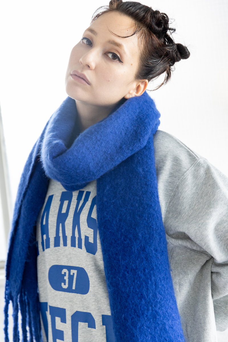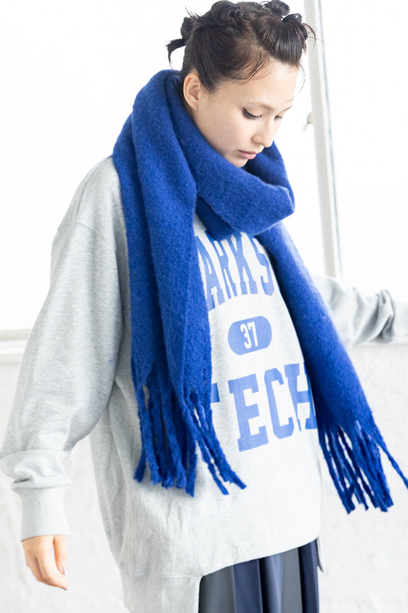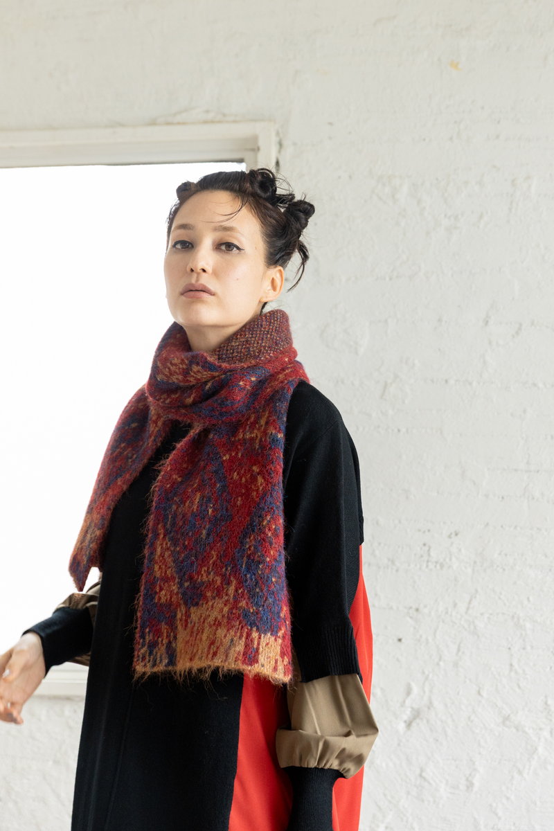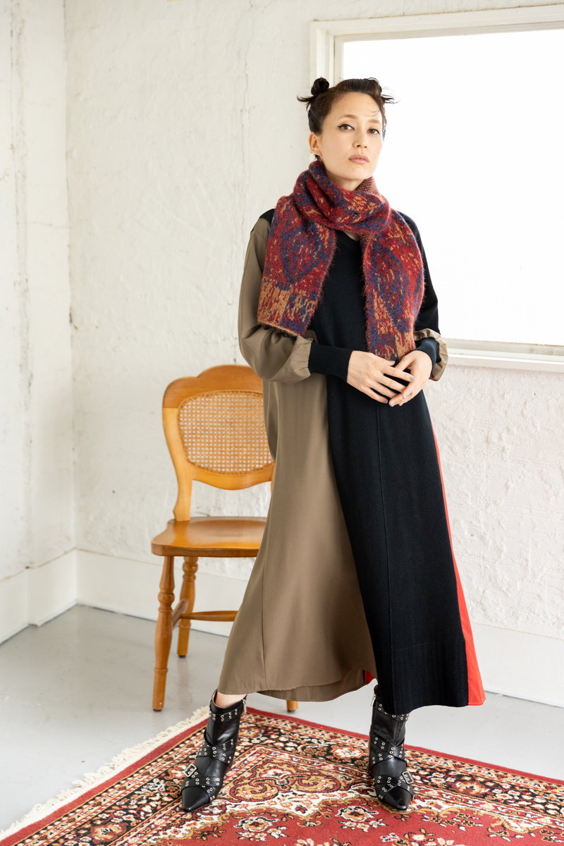 鮮やかなREDをストールにも添えて、