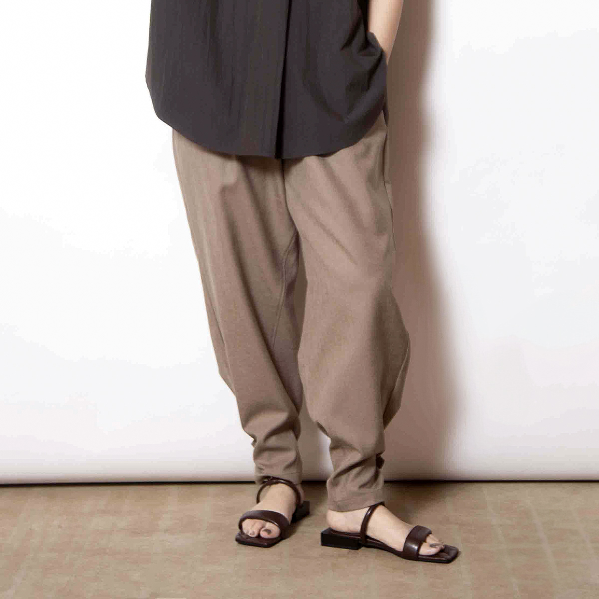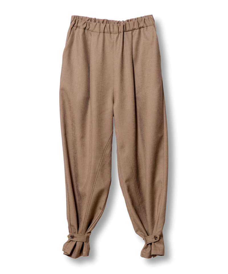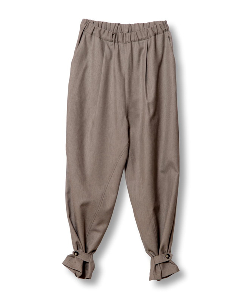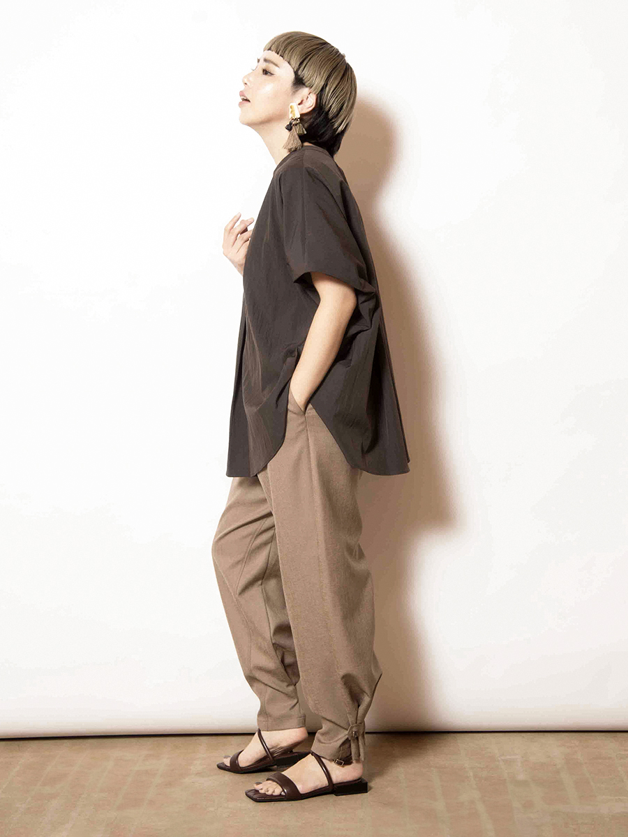 裾に付けたベルトでジョガーシルエットにアレンジが可能。