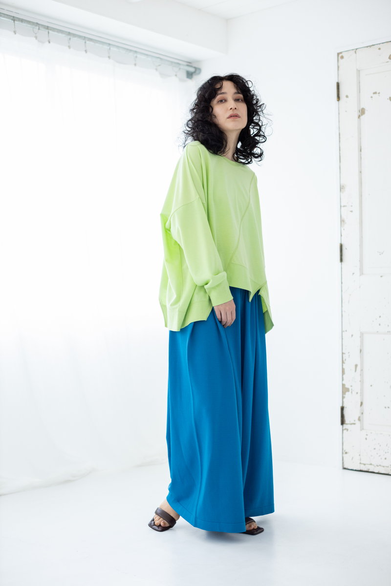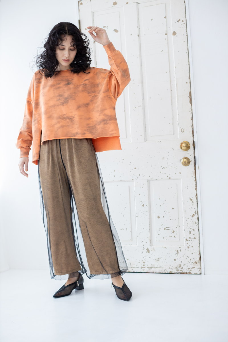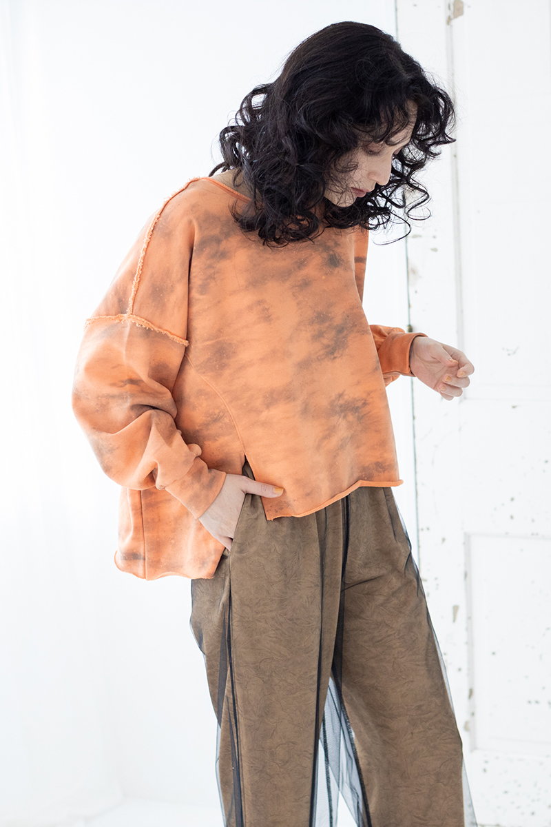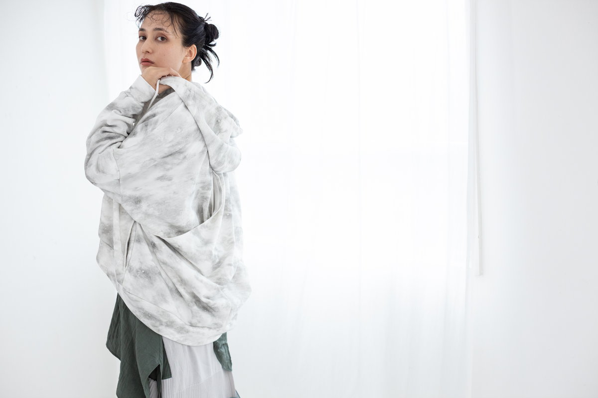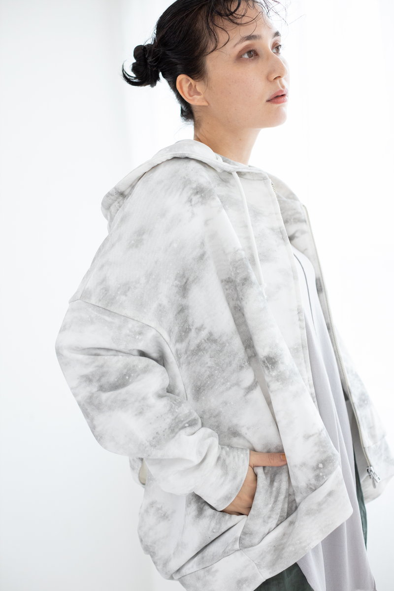 タイダイ風プリントがキーのワイドプルオーバー。