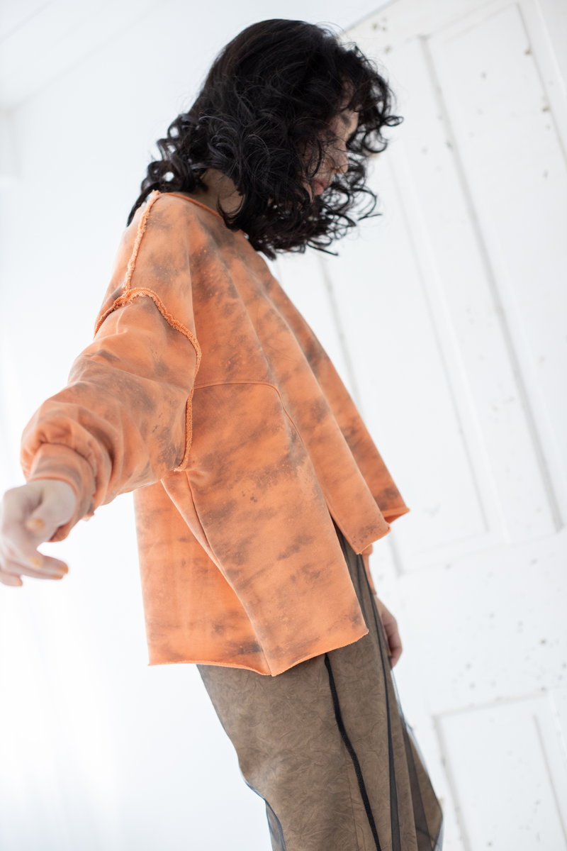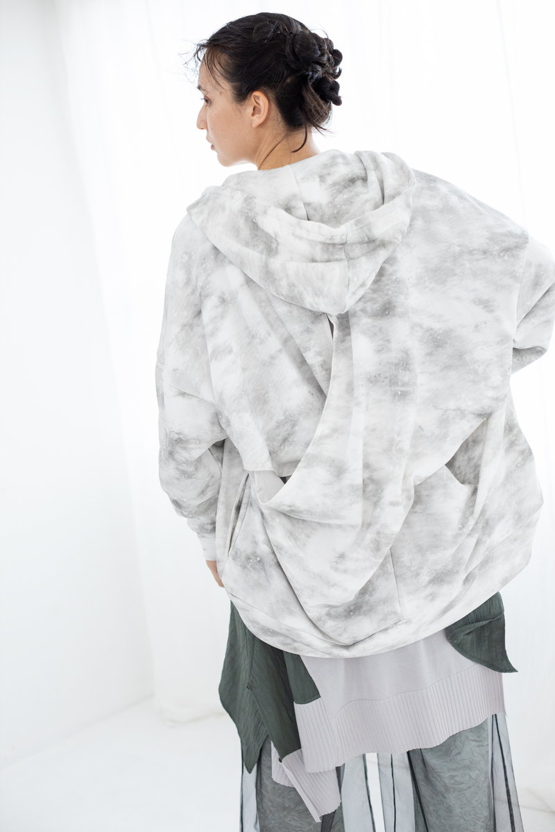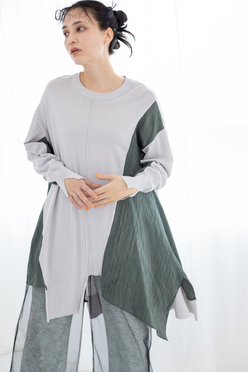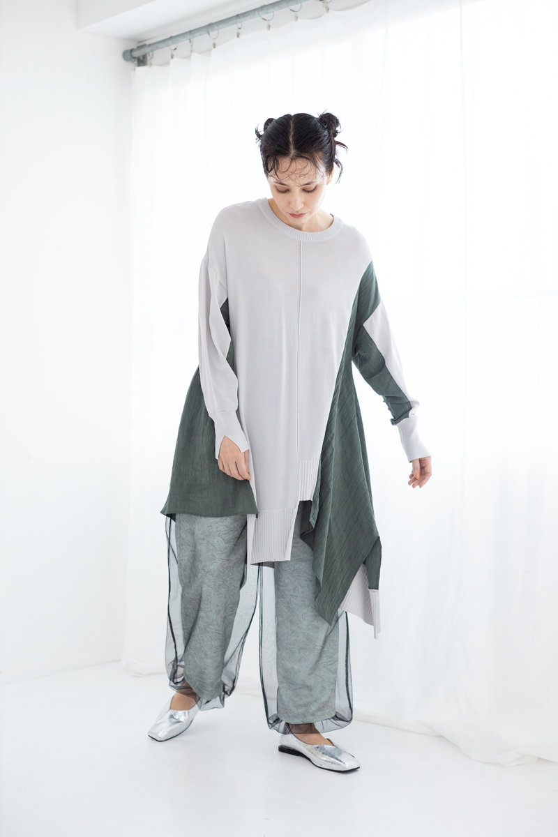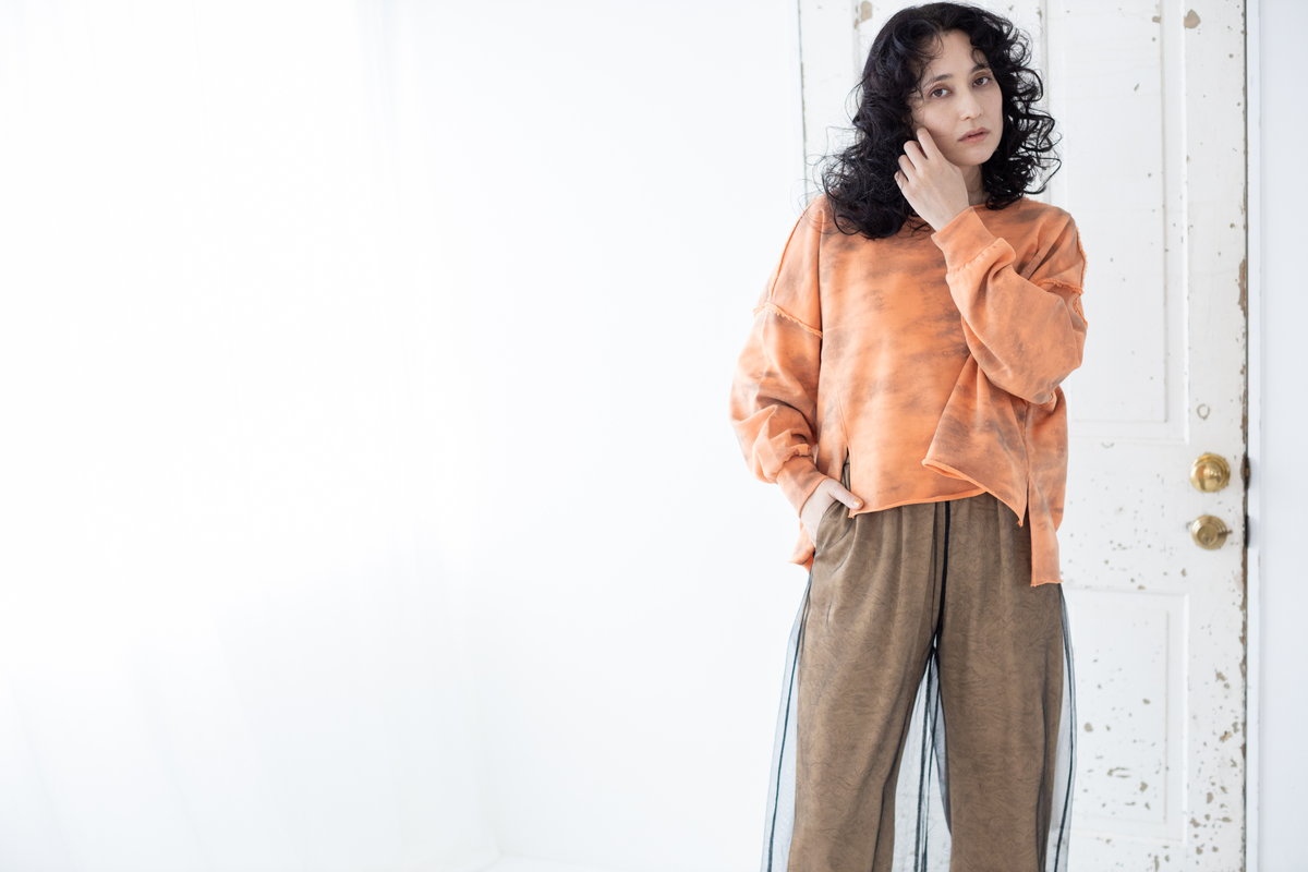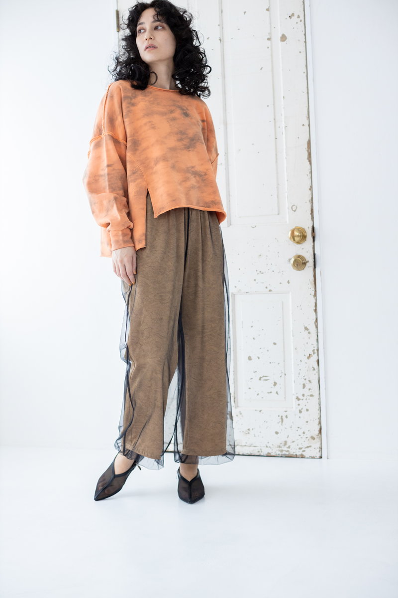 タイダイ風プリントがキーのワイドプルオーバー。
